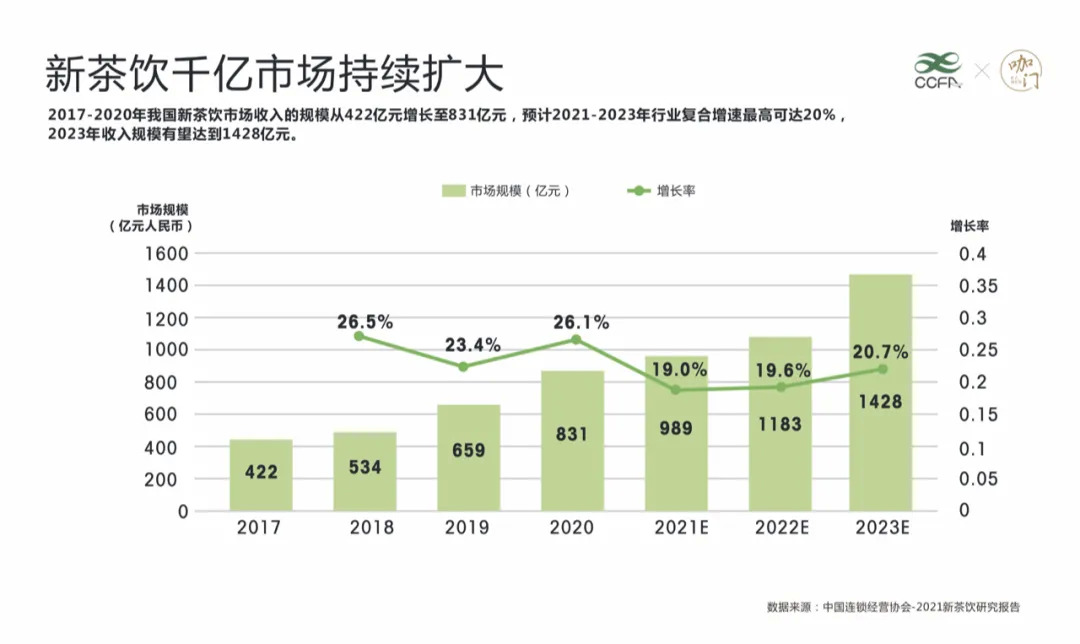 根据《报告》数据显示,2017~2020年,我国新茶饮市场收入的规模从422亿元增长至831亿元,预计2023年有望达到1428亿元。