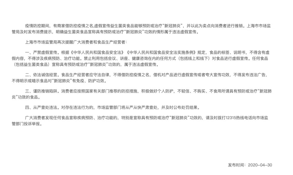 且在去年4月底,上海市市场监督管理局还专门发文《谨防益生菌类食品虚假宣传》,为消费者和相关企业提醒。