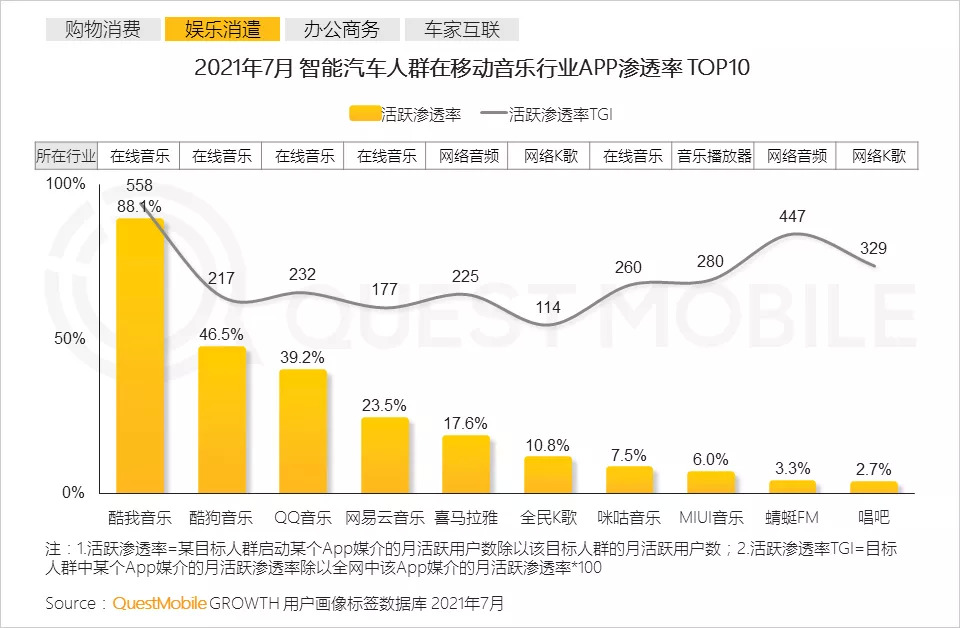 4、车载场景中,由于驾驶对视觉集中度的天然要求,用户对音频的依赖度更高,智能汽车人群对于音乐音频类APP偏好显著,汽车已经成为了重要的音乐娱乐消费场景