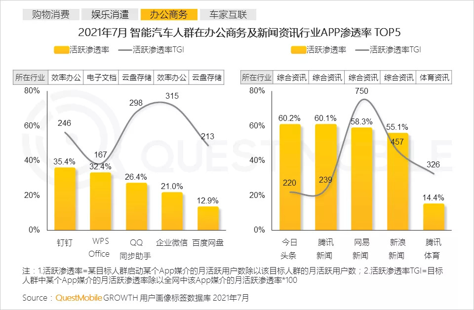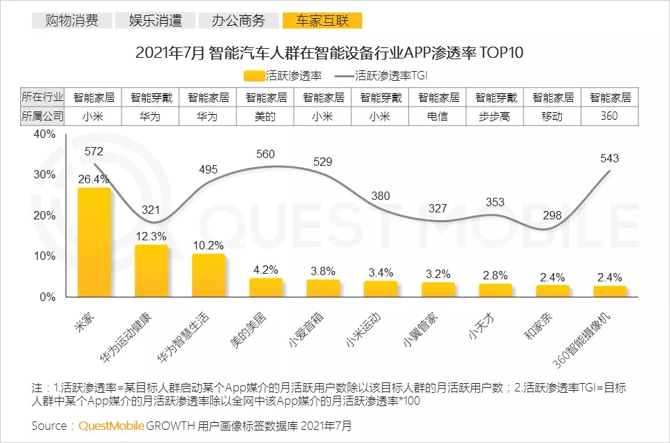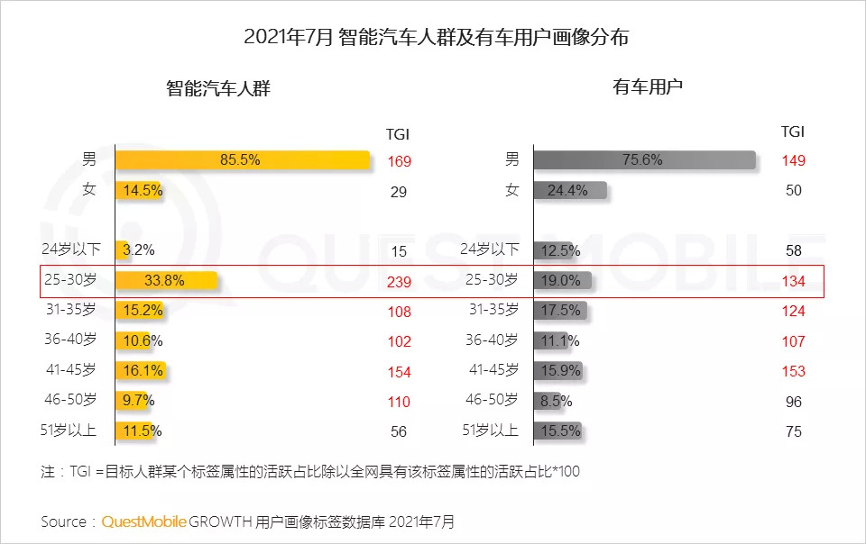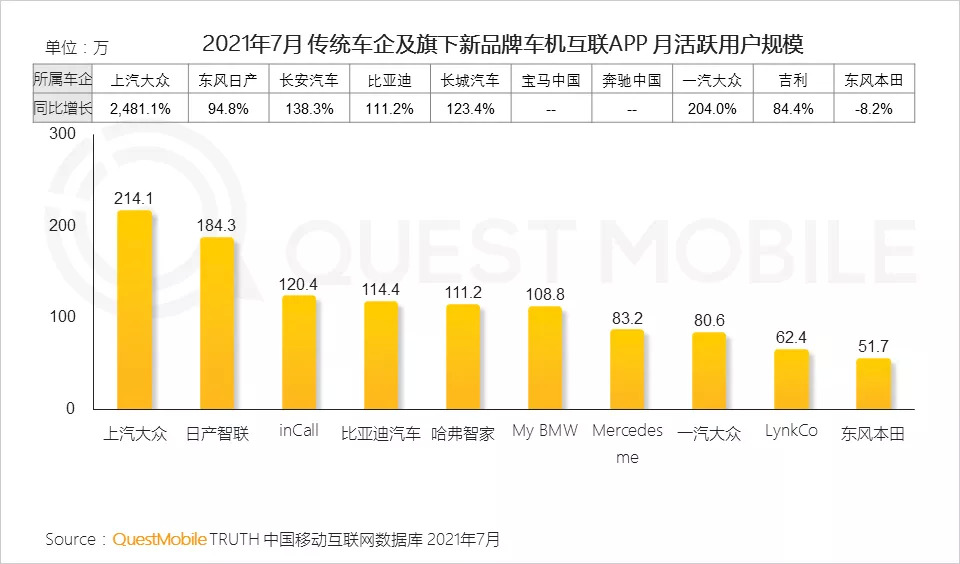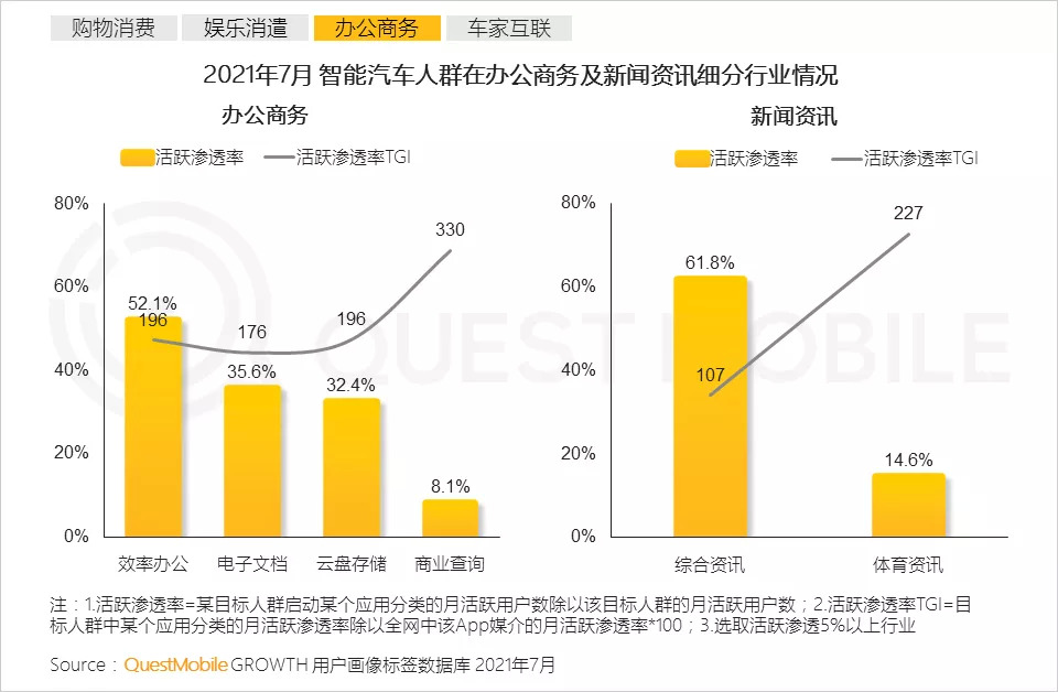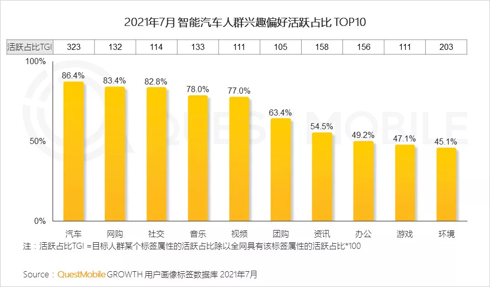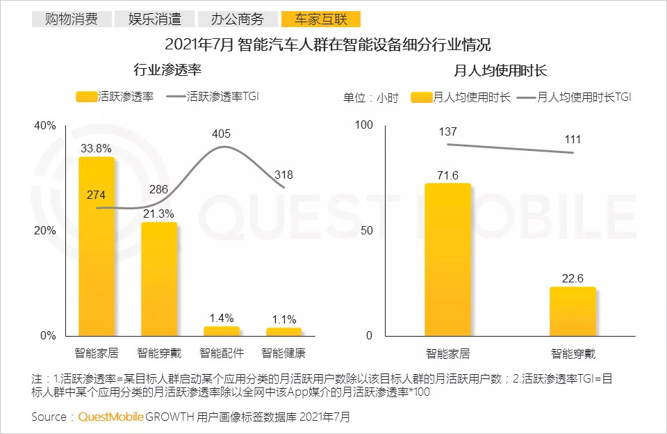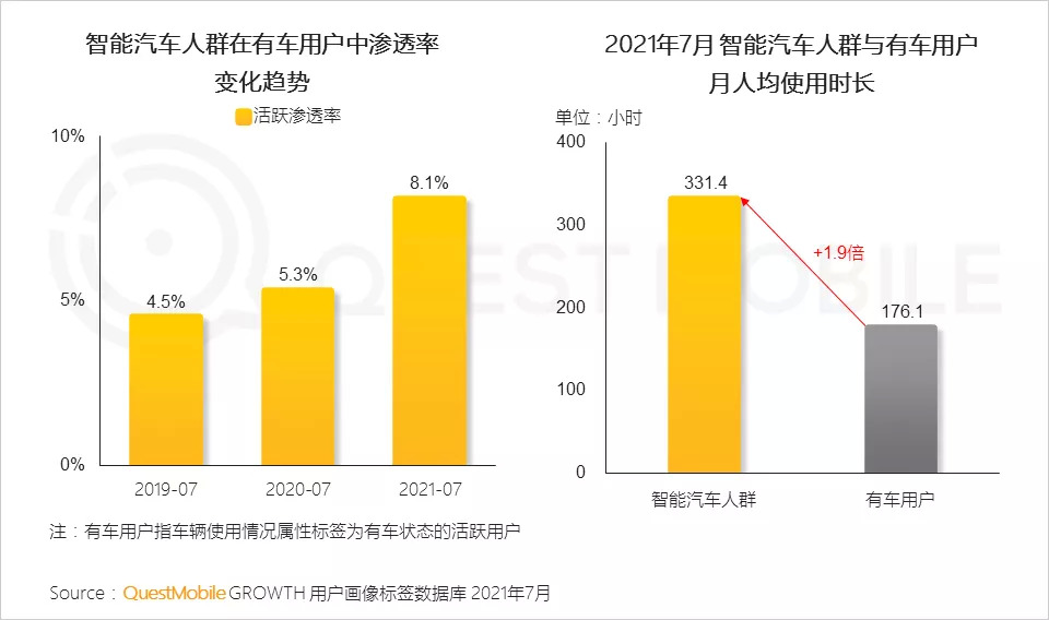 根据QuestMobile数据,2021年7月,智能汽车人群月人均使用时长331.4小时,达到有车用户时长的1.9倍。