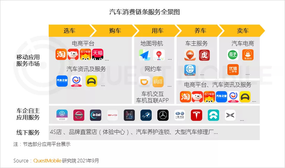 2、移动应用服务市场围绕汽车消费链条已形成多元化服务平台,车企数字化升级趋势下,自主APP服务能力愈加完善,普遍具备车机互联服务