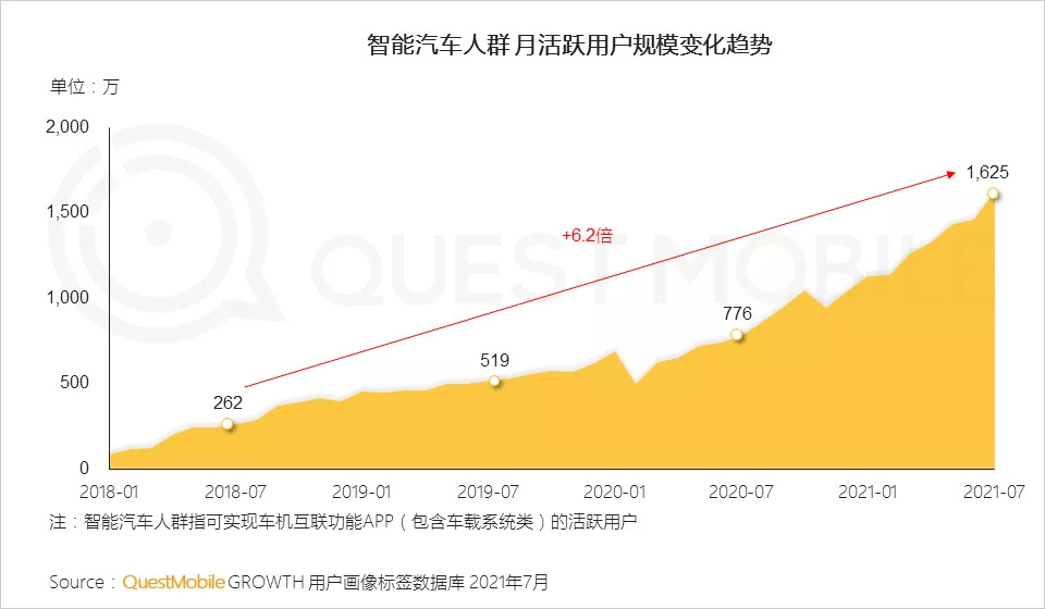 根据QuestMobile数据,2021年7月,智能汽车人群月活跃用户规模达1,625万,相较2018年同期提升6.2倍。