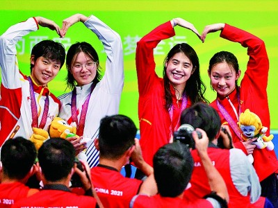 9月23日,全运会游泳女子4×200米自由泳接力决赛,联合队获冠军。光明日报记者 郭红松摄/光明图片