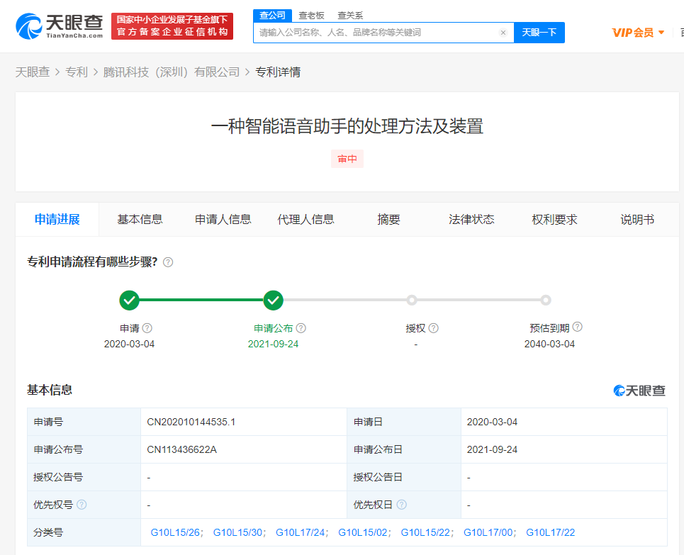 据天眼查APP显示,9月24日,腾讯科技(深圳)有限公司公开“一种智能语音助手的处理方法及装置”专利,公开号CN113436622A,申请日期为2020年3月。