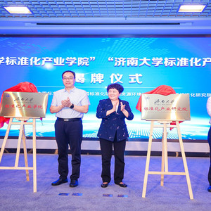 正式揭牌时,山东省委教育工委副书记,省教育厅党组副书记、副厅长冯继康、山东省工业和信息化厅一级巡视员罗新军共同为“济南大学标准化产业学院”揭牌;国家市场监督管理总局标准技术管理司原司长、中国标准化协会理事长于欣丽、济南大学党委书记徐景颜共同为“济南大学标准化产业研究院”揭牌。