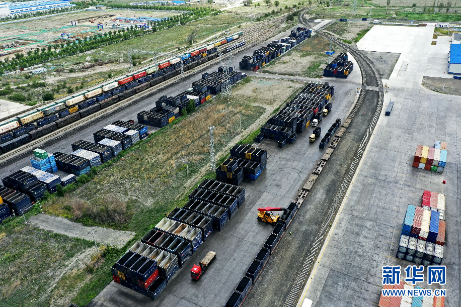 同时,该物流港积极开展第三方物流服务,开辟了石河子市铁路运输的新兴市场,发运品种有化肥、葡萄酒(汁)、粮食等几十种。图为俯瞰天业集团多式联运国际综合物流港。新华网 詹婧 摄