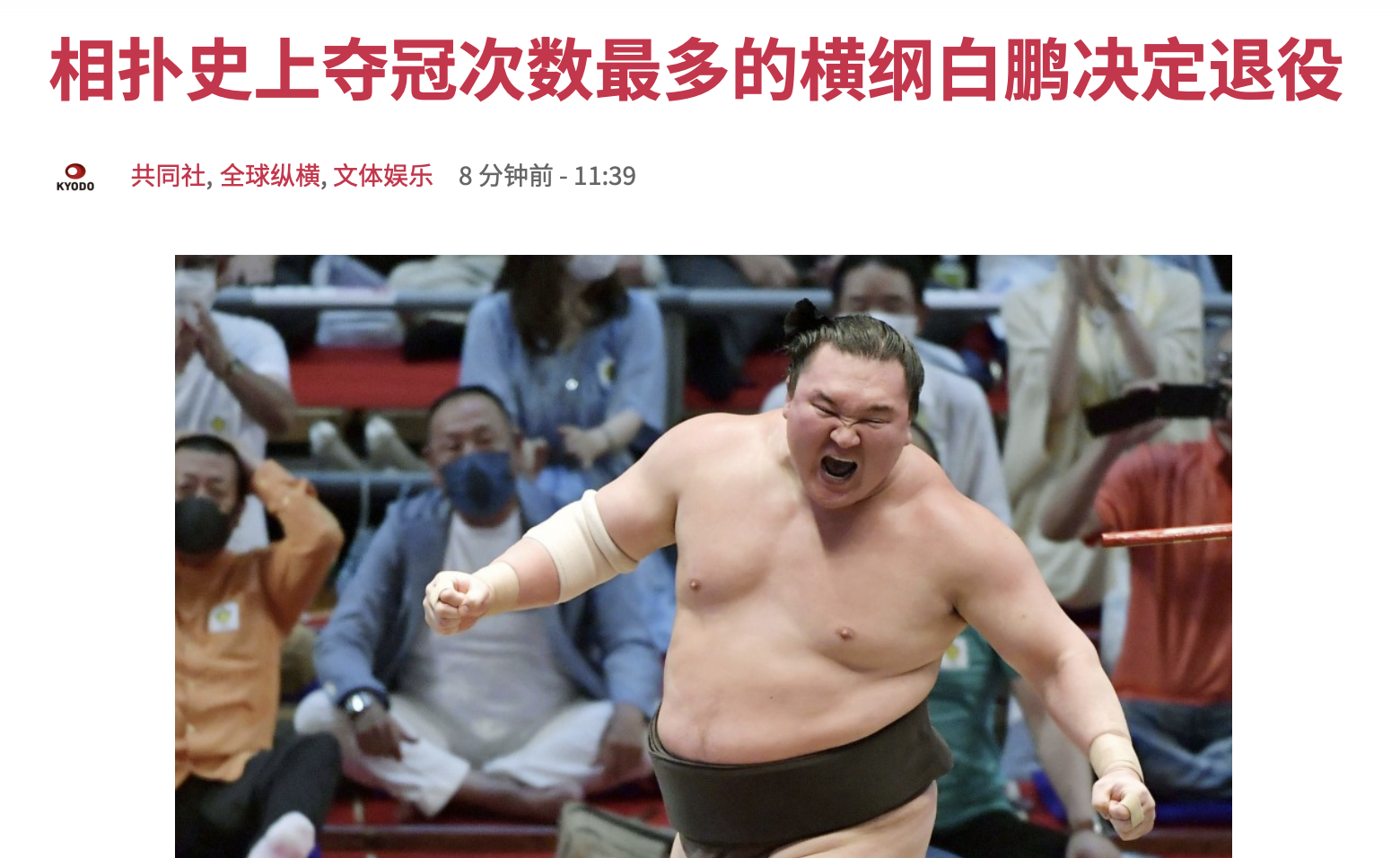 据日本共同社9月27日报道,据相关人士当天透露,日本相扑历史上创纪录地夺冠45次的第69代横纲白鹏基本决定退役。