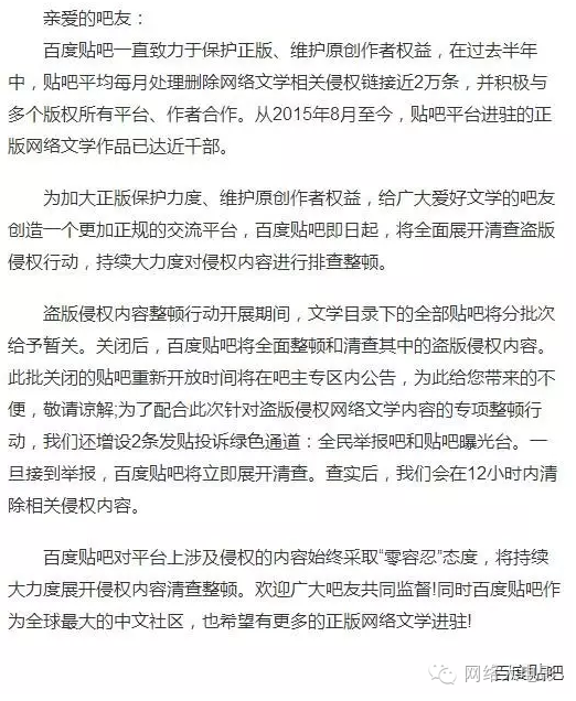 昨日凌晨,百度发布公告,宣布将陆续关停“百度贴吧”文学目录下的全部贴吧,进行全面整顿和清查其中的盗版侵权内容。并开设专属举报通道,为原创平台及作者提供维权渠道。