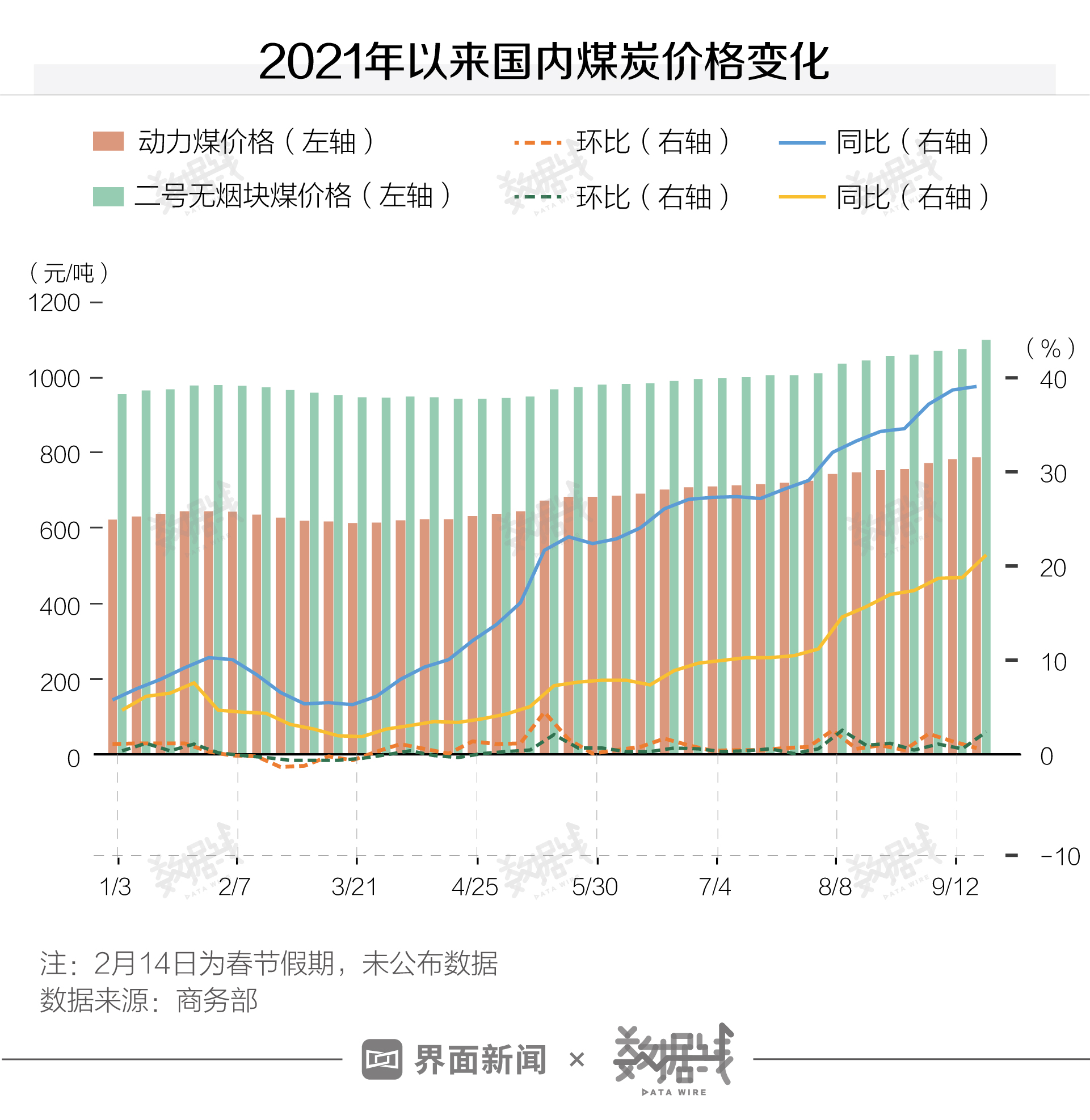 煤炭越来越不够用,价格自然也跟着上涨。据商务部数据,2021年以来,国内煤炭价格总体呈上涨趋势。1月至8月,煤炭价格同比持续上涨。4月以来,煤炭价格环比连续5个月上涨。最新数据(9月13日-19日)显示,动力煤价格为780元/吨,较年初上涨约27%。二号无烟块煤价格为1089元/吨,较年初上涨约15%。