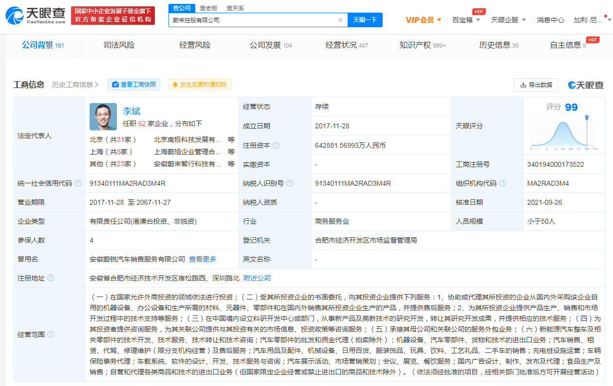 据天眼查App显示,9月27日,蔚来控股有限公司发生工商变更,企业注册资本增至约64.29亿人民币。该公司成立于2017年11月,法定代表人为李斌,经营范围包括在中国境内设立科研开发中心或部门,从事新产品及高新技术的研究开发;承接其母公司和关联公司的服务外包业务;新能源汽车整车及相关零部件的技术开发、技术服务、技术转让和技术咨询等。