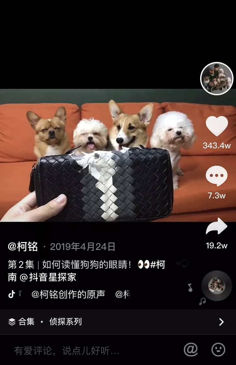 又比如在作为在抖音平台上拥有1620.7万粉丝的“柯铭”,其创作的短视频主要围绕自己家的四只宠物狗展开,通过各种热门话题,如之前抖音比较热门的“换装”“宠物拆家”话题,结合四小只的特点,进行内容输出。