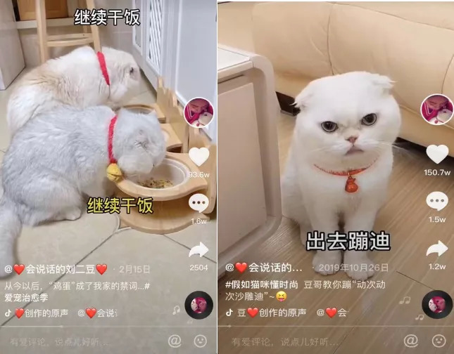 其中,作为拥有4100多万粉丝的“会说话的刘二豆”,是在抖音平台上,最先启用宠物拟人化的宠物账号,在该账号的作品中,作为出镜主角的萌宠“刘二豆”经常被视频作者拟人化后进行互动,因拟人且具有话题性,引发了粉丝的转发与点赞。