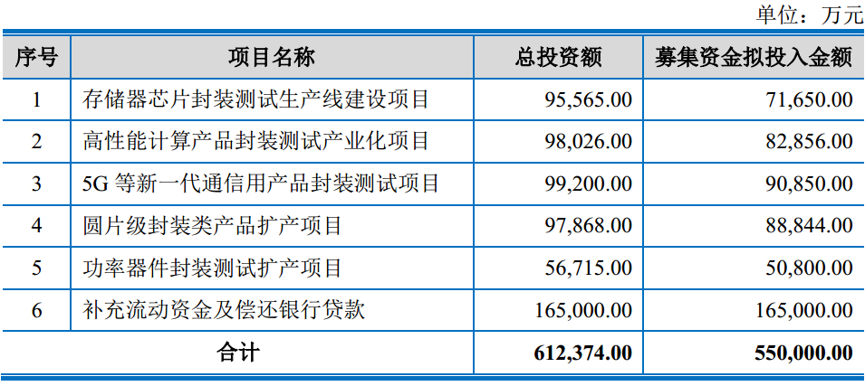 其中,存储器芯片封装测试生产线建设项目建成后,年新增存储器芯片封装测试生产能力1.44亿颗,其中wBGA(DDR)1.08亿颗、BGA(LPDDR)0.36亿颗;项目建设期2年,项目达产后预计新增年销售收入5.04亿元,新增年税后利润5821.15万元。其次,高性能计算产品封装测试产业化项目建成后,年新增封装测试高性能产品32160万块的生产能力,其中FCCSP系列3亿块,FCBGA系列2160万块;项目建设期2年,项目达产后预计新增年销售收入11.53亿元,新增年税后利润1.12亿元。
