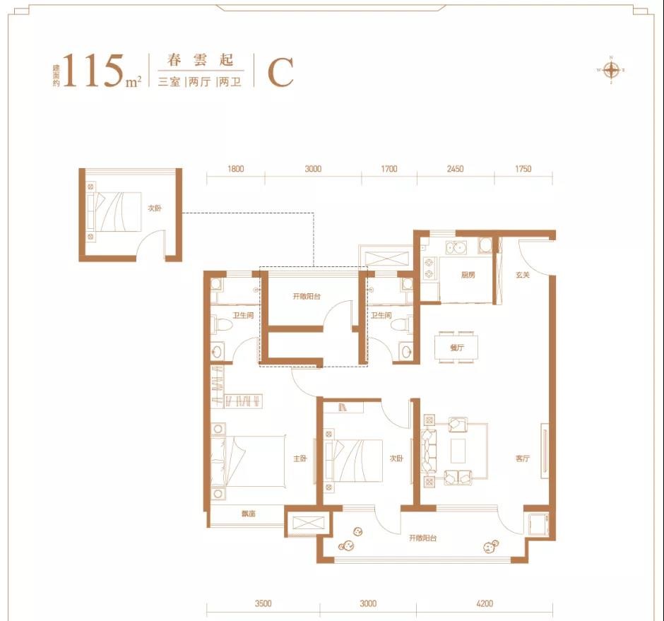 建面约115㎡三室两厅两卫户型,动静分区明确,互不干扰。入户玄关在提升归家仪式感的同时,收纳功能强大。主卧套房设计,独卫、衣帽间、飘窗一应俱全,自成南北通透的一方尊享天地,舒适性不言而喻。