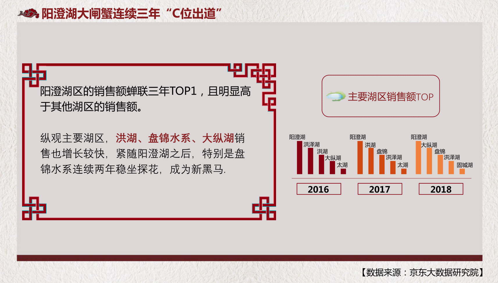 再从“销”的角度来看,阳澄湖当地大闸蟹2009年率先开始在线上销售,从那至今,都沿袭了“线上+线下”的双渠道销售途径。