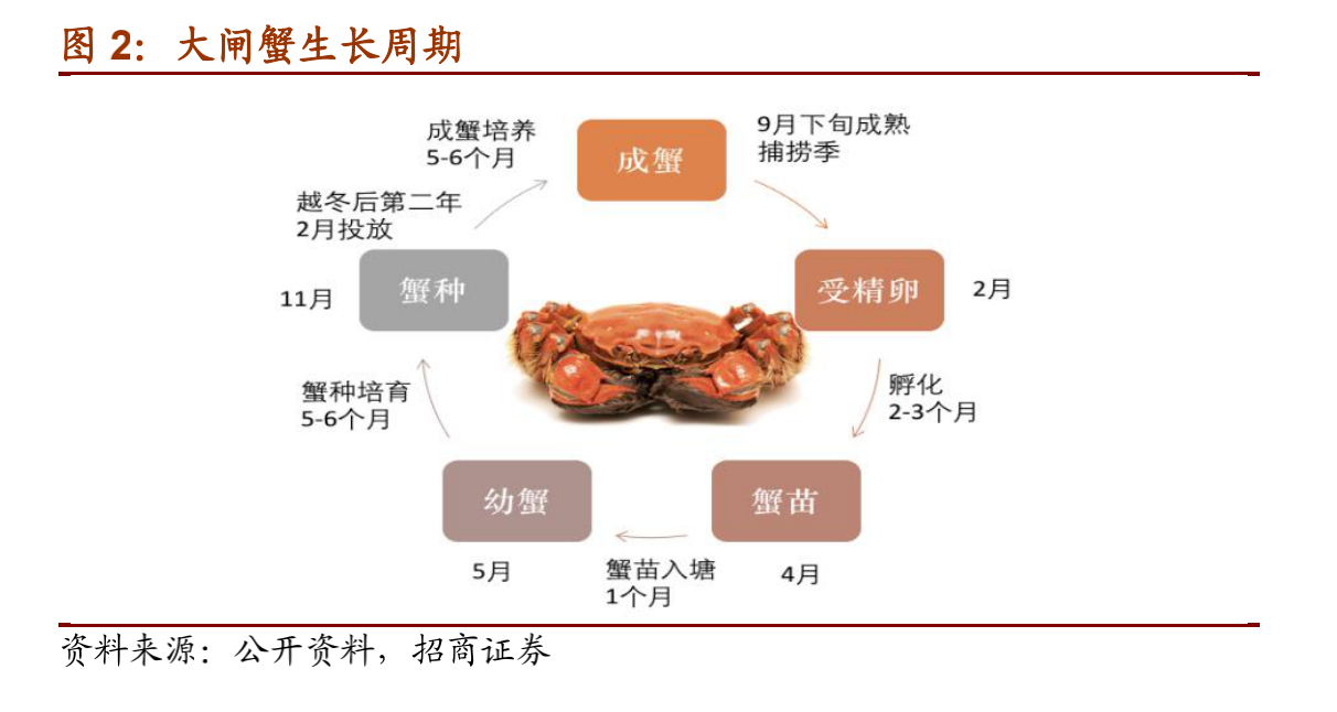 先从“产”的角度来看。一只大闸蟹从胚胎到成蟹,一般要经历两年时间,且在“蟹苗-幼蟹-蟹种-成蟹”的培育过程中,只有经过挑选的优良蟹种才会进行成蟹培育。捕捞时间也较为固定,蟹一般会在9月下旬逐渐成熟,进入捕捞季,售卖高峰期一般在两个月左右。
