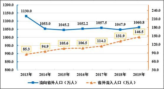安徽省统计局发布的报告指出,安徽省作为外出人口大省,2012年以前该省净流出人口持续增加,2013年安徽省首次出现外出人口回流现象,至2018年已连续六年持续回流。但统计数据显示,省际流出人口要远大于省际流入人口。2019年,安徽省际流出人口为1060.8万人,省际流入人口只有146.5万人。