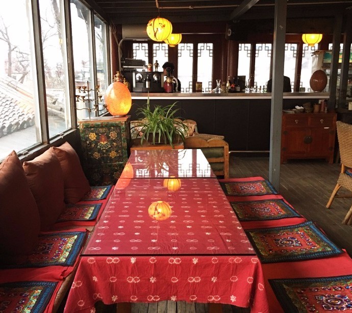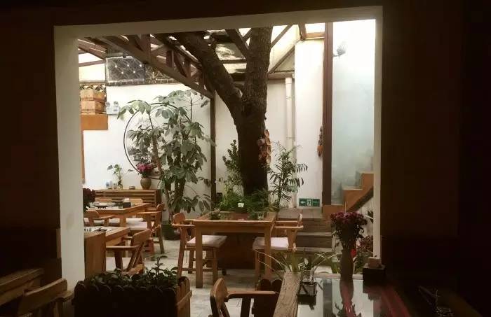这里的装潢古旧朴实,木制地板走起来吱吱呀呀,藤椅、扎染桌布,还有灯笼式样的吊灯,一切看起来都旧模旧样的,让人想起了云南丽江的那些木结构四合院。