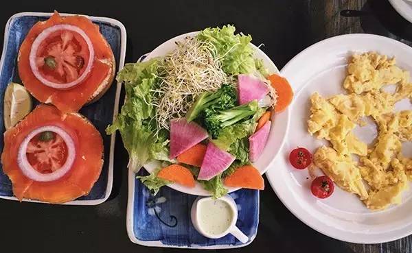 这里的披萨、沙拉和蛋糕都好吃,烟熏三文鱼贝果更是每桌必点。韧劲十足的贝果搭配柔嫩鱼肉和新鲜番茄,香滑鲜甜,越嚼越香,将周末贪睡的胃口悄悄唤醒。