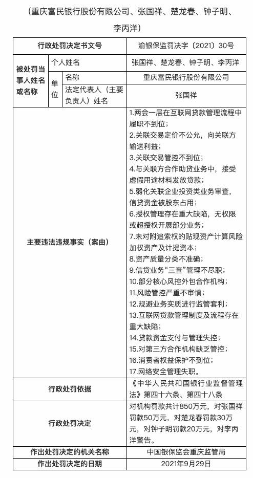 9月30日,重庆银保监局发布的行政处罚信息公开表显示,重庆富民银行股份有限公司因存在互联网贷款管理制度及流程存在重大缺陷等17项违法违规行为被处罚款共计850万元。同时,重庆银保监局对张国祥罚款50万元,对楚龙春罚款30万元,对钟子明罚款20万元,对李丙洋警告。