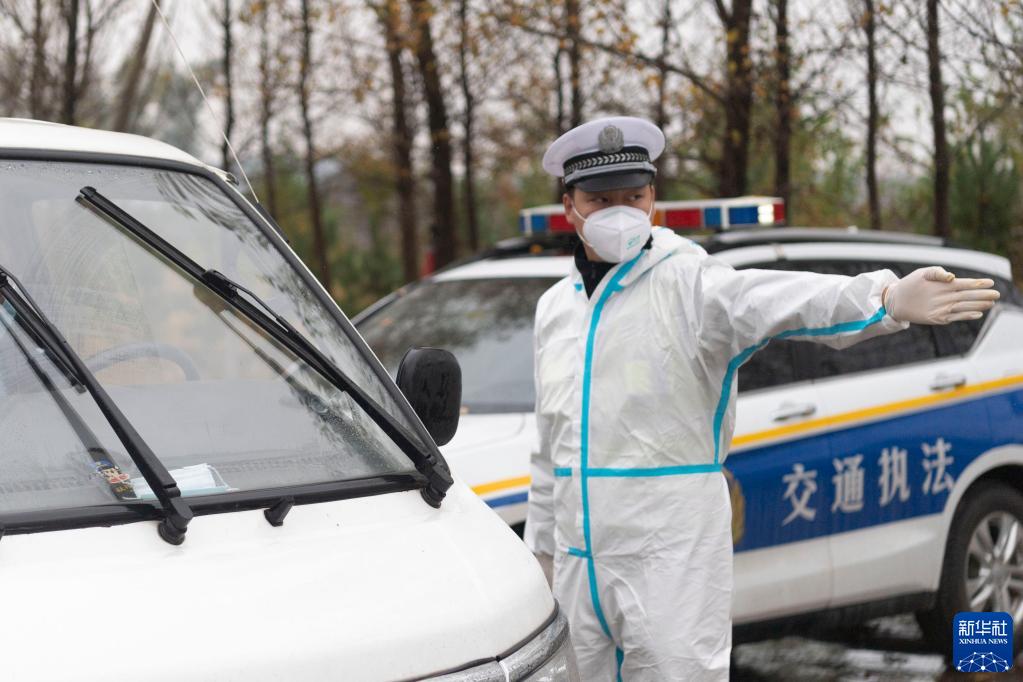 在哈尔滨市巴彦县进出城的防疫卡口,巴彦县公安局交通管理大队交警王艳鹏查验过往车辆(9月27日摄)。新华社记者 谢剑飞 摄