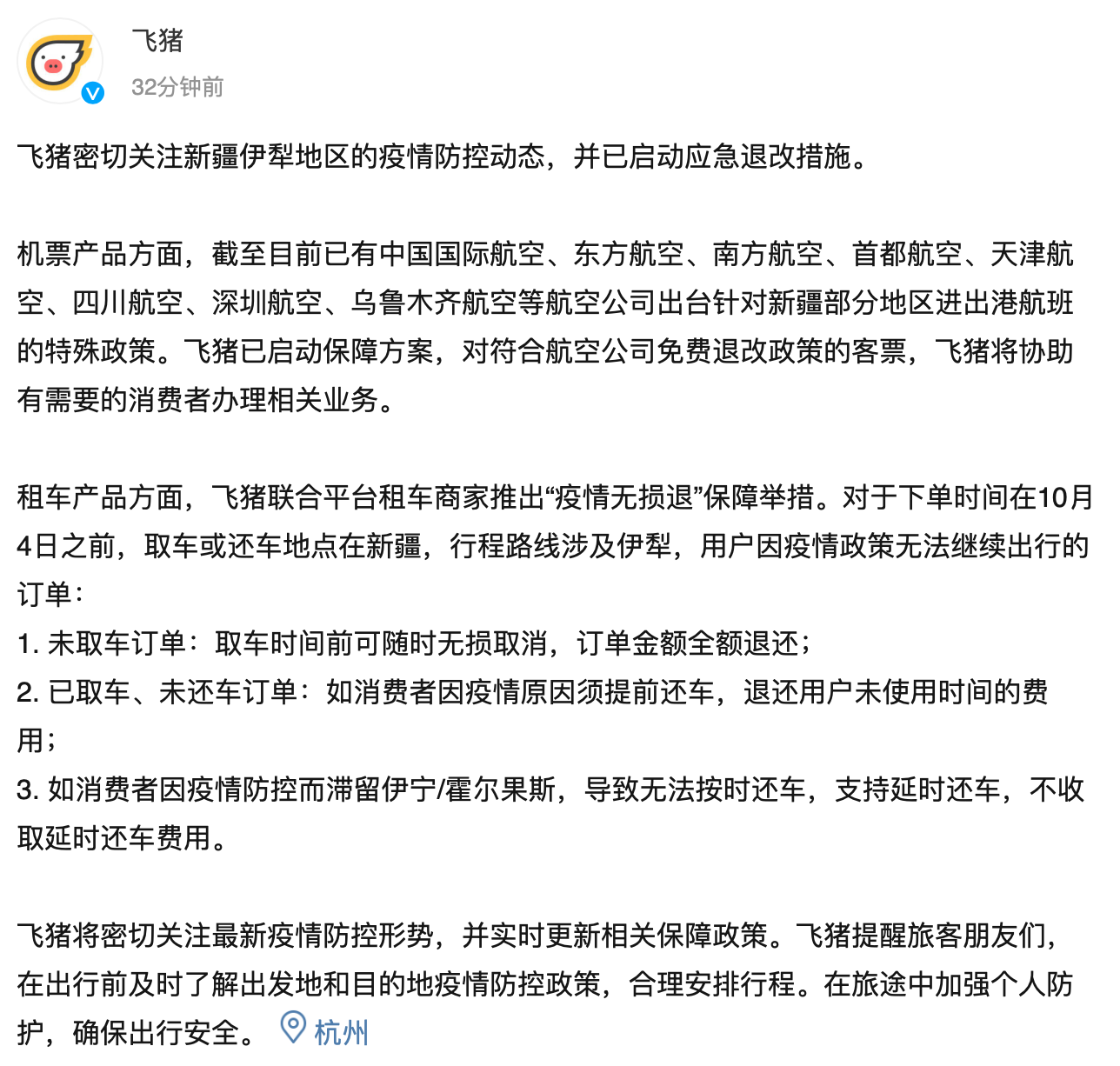 10月4日,@飞猪 表示,公司密切关注新疆伊犁地区的疫情防控动态,并已启动应急退改措施。