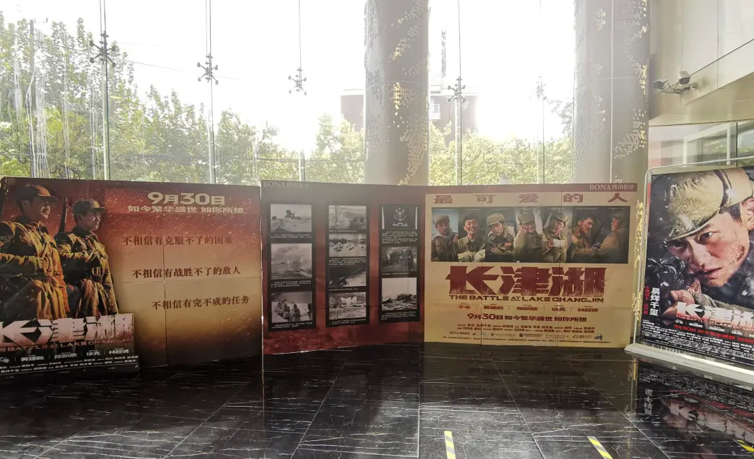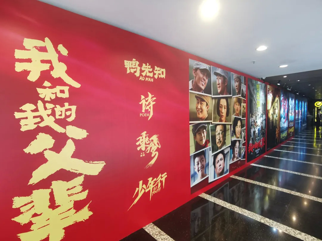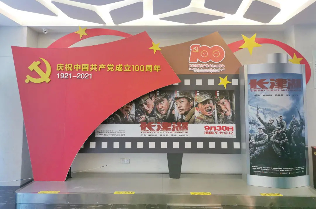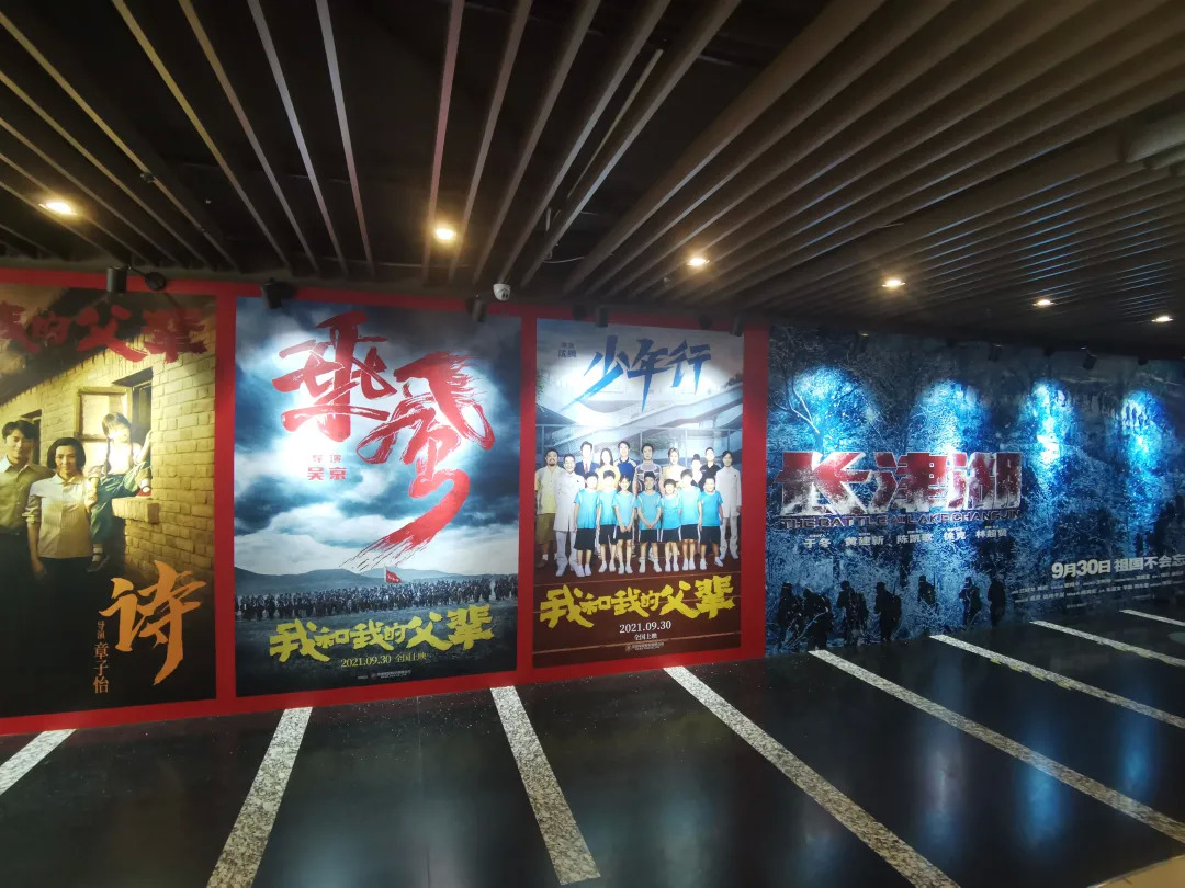 曹杨影城还设置了电影海报、主题展板、宣传片等红色主题布置,为观影者提供合影留念的区域,进一步深化爱国主义教育。