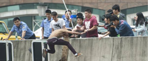 现场网友提供的数段视频显示,该男子遭遇桥上一拿有长杆的男子鞭打。另有一名身着迷彩服男子,挥舞着手中的扫帚,朝轻生男子叫嚷并鼓掌。男子在长杆的鞭打下,往桥边跳,双手欲攀爬桥边。结果是,该男子并未攀爬到桥边,也未落在安全气垫上,而是摔在了地上。