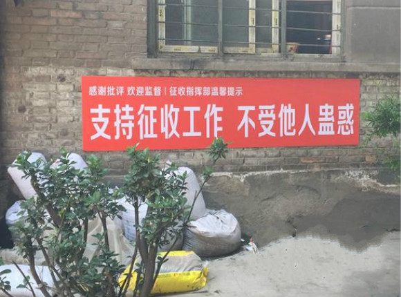 “支持征收工作,不做过街老鼠。”“支持征收工作,不受他人蛊惑。”“早日签约早日得利,观望拖延一场空。”近日,这样的标语出现在雁塔区粮食局的家属院内,标语悬挂者是红会医院西侧棚户区改造项目征收指挥部。