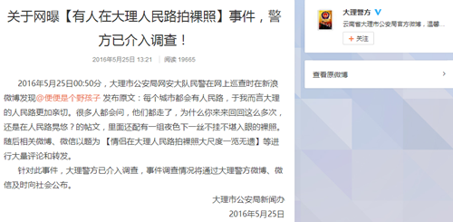 大理市公安局官方微博今日发布消息,2016年5月25日00:50分,大理市公安局网安大队民警在网上巡查时在新浪微博发现@便便是个野孩子发布原文:每个城市都会有人民路,于我而言大理的人民路更加亲切。很多人都会问,他们都走了,为什么你来来回回这么多次,还是在人民路晃悠?的帖文,里面还配有一组夜色下一丝不挂不堪入眼的裸照。