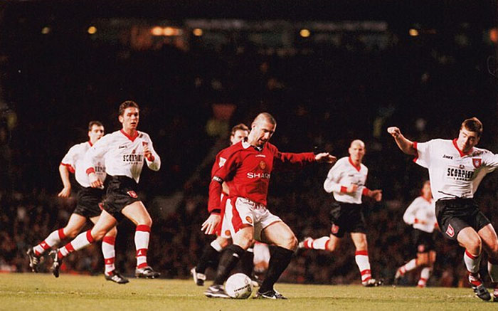 这体现了坎通纳的细腻球感。1994年,曼联队在温布尔登迎来了足总杯第五轮的比赛。这场比赛直到第43分钟双方都还没有打破场上的僵局,这时,丹尼斯·欧文在左后卫的位置向前送出了一记长传,这记传球的路线不甚清晰,但是坎通纳停球之后直接用右脚将球抽进了对方的球门。曼联队最终3比0获胜,他们在那个赛季不仅获得了足总杯的冠军,还完成了双冠王的伟业。