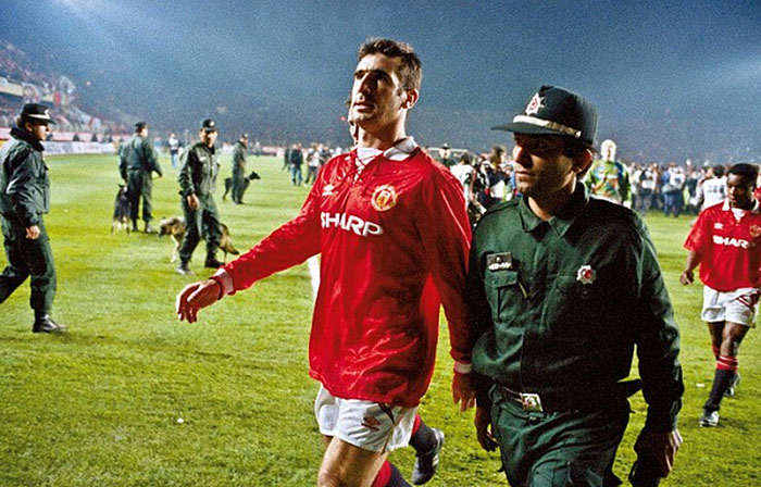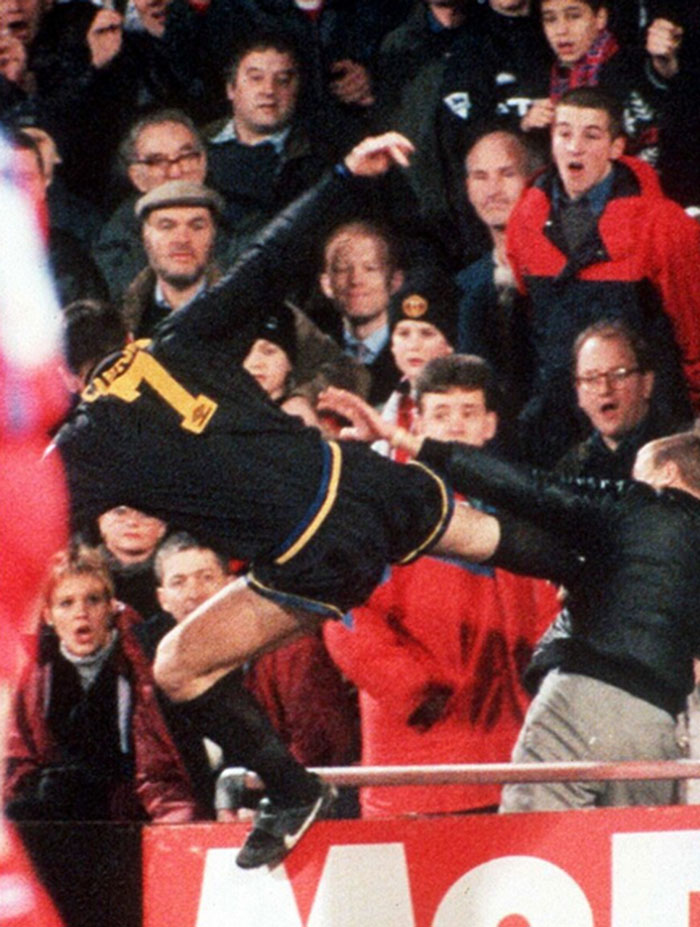 在1995年曼联队同水晶宫队的比赛中,坎通纳被罚出场时受到了主场球迷马修·西蒙斯的侮辱。坎通纳失去了理智,他跳过了广告牌,用一记功夫式的飞踹踢向了这名球迷。