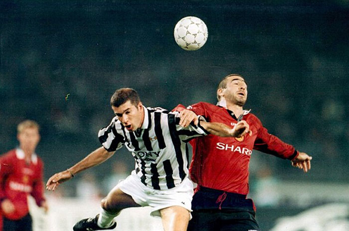 坎通纳与当时效力于尤文图斯队的齐内丁·齐达内争顶。 图片来源:网络