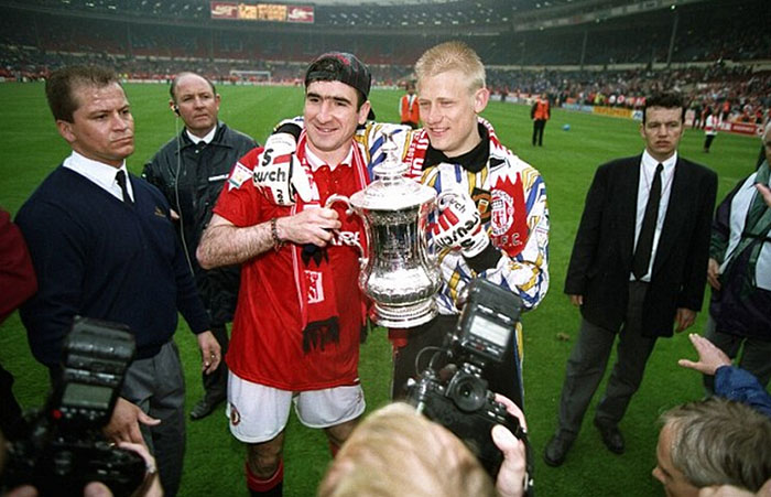在1994年的足总杯决赛4比0战胜切尔西队夺冠之后,坎通纳与皮特·舒梅切尔手拿冠军奖杯合影。 图片来源:网络
