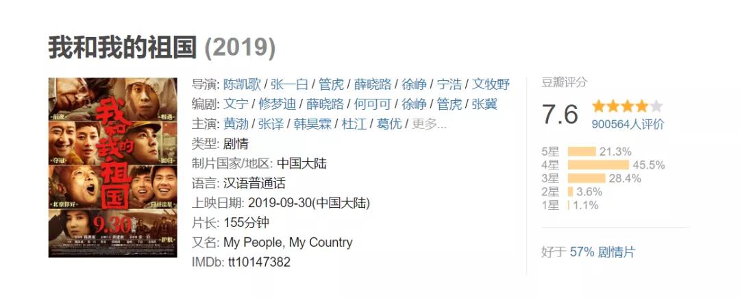 《我和我的祖国》淘票票评分最终达到9.4分,豆瓣评分目前仍有7.6分。上映后,在“原来主旋律也可以这么好看”的口碑号召下,《我和我的祖国》最终票房达到了31.7亿,位列中国电影票房榜第十名。