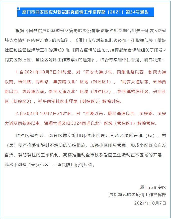 据“同安发布”消息,10月7日,厦门市同安区发布疫情防控第34号通告。自2021年10月7日21时起,对“同安大道以东,同集北路以西,新民大道以南,梧侣路、同辉路、集安路以北”区域(封控区1)、“同安大道以东,环城西路以西,凤岭路以南,新民大道以北”区域(封控区2)、新民镇梧侣社区、兴店社区(封控区3)、祥平西湖社区山坪里(封控区5)解除封控。自2021年10月7日21时起,对“西溪以东,厦沙高速以西,同莲路、同安大道及同新路以南,海翔大道及旧G324国道以北”区域(管控区1)解除管控。