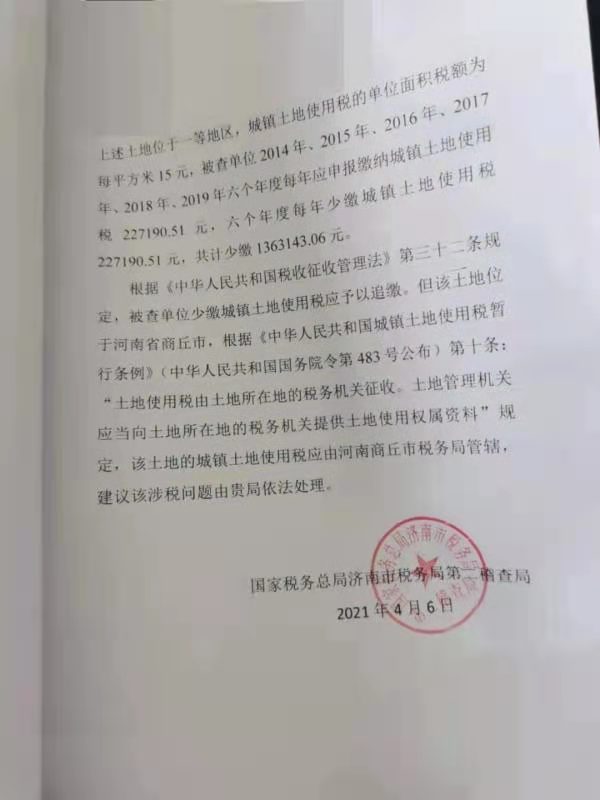 国家税务总局济南市税务局第二稽查局发出的情况说明显示,经该局调查,山东蓝翔房地产开发有限公司在河南省商丘市的一处房地产开发项目中,于2014年至2019年六个年度,共计少缴城镇土地使用税1363143.06元。
