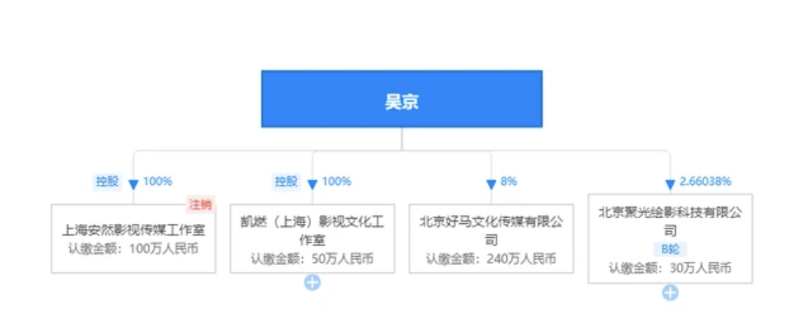 据天眼查显示,吴京担任四家公司的股东,四家公司分别为上海安然影视传媒工作室、凯燃(上海)影视文化工作室、北京好马文化传媒有限公司、北京聚光绘影科技有限公司。其中,吴京全资控股前两家公司,并持有后两家公司8%及2.66的股权。