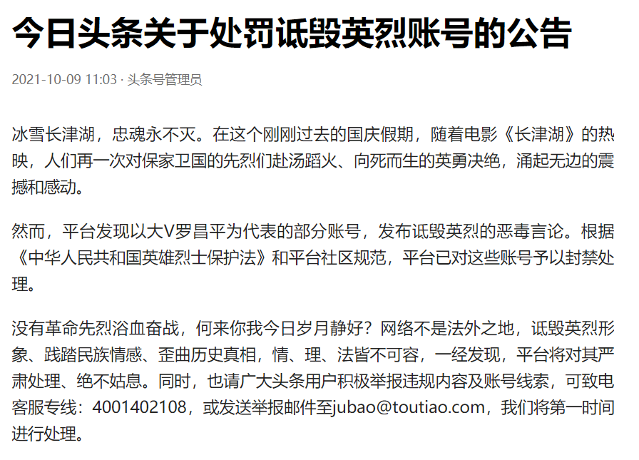 据今日头条号管理员10月9日消息,今日头条发布关于处罚诋毁英烈账号的公告。以大V罗昌平为代表的部分账号,发布诋毁英烈的恶毒言论。根据《中华人民共和国英雄烈士保护法》和平台社区规范,今日头条平台已对这些账号予以封禁处理。网络不是法外之地,诋毁英烈形象、践踏民族情感、歪曲历史真相,情、理、法皆不可容,一经发现,平台将对其严肃处理、绝不姑息。