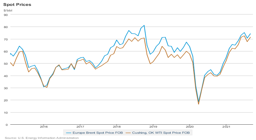 截至10月5日,全球原油价格的主要参考物布伦特原油与WTI原油分别收82.59美元/桶、79美元/桶,均创近七年来最高值,月平均价格较疫情期间低点上涨超3倍。