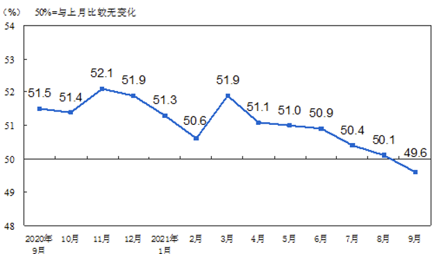 官方数据看,9月制造业PMI为49.6%,降至50%的临界点以下,为今年以来的最低点。
