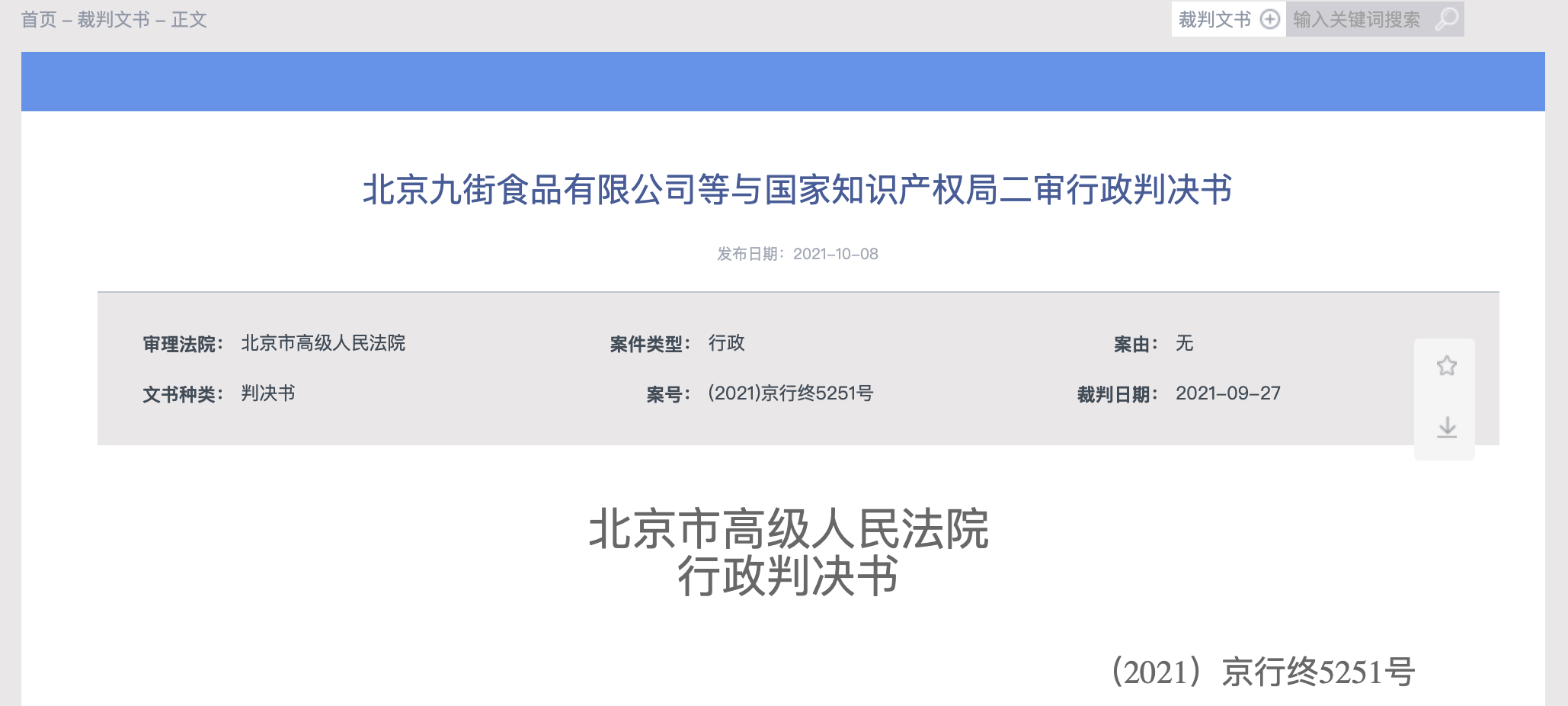 据天眼查APP显示,10月8日,北京法院审判信息网公开北京九街食品有限公司等与国家知识产权局二审行政判决书,原审原告为九街食品公司,原审第三人为B站关联公司上海幻电信息科技有限公司。案号为(2021)京行终5251号。