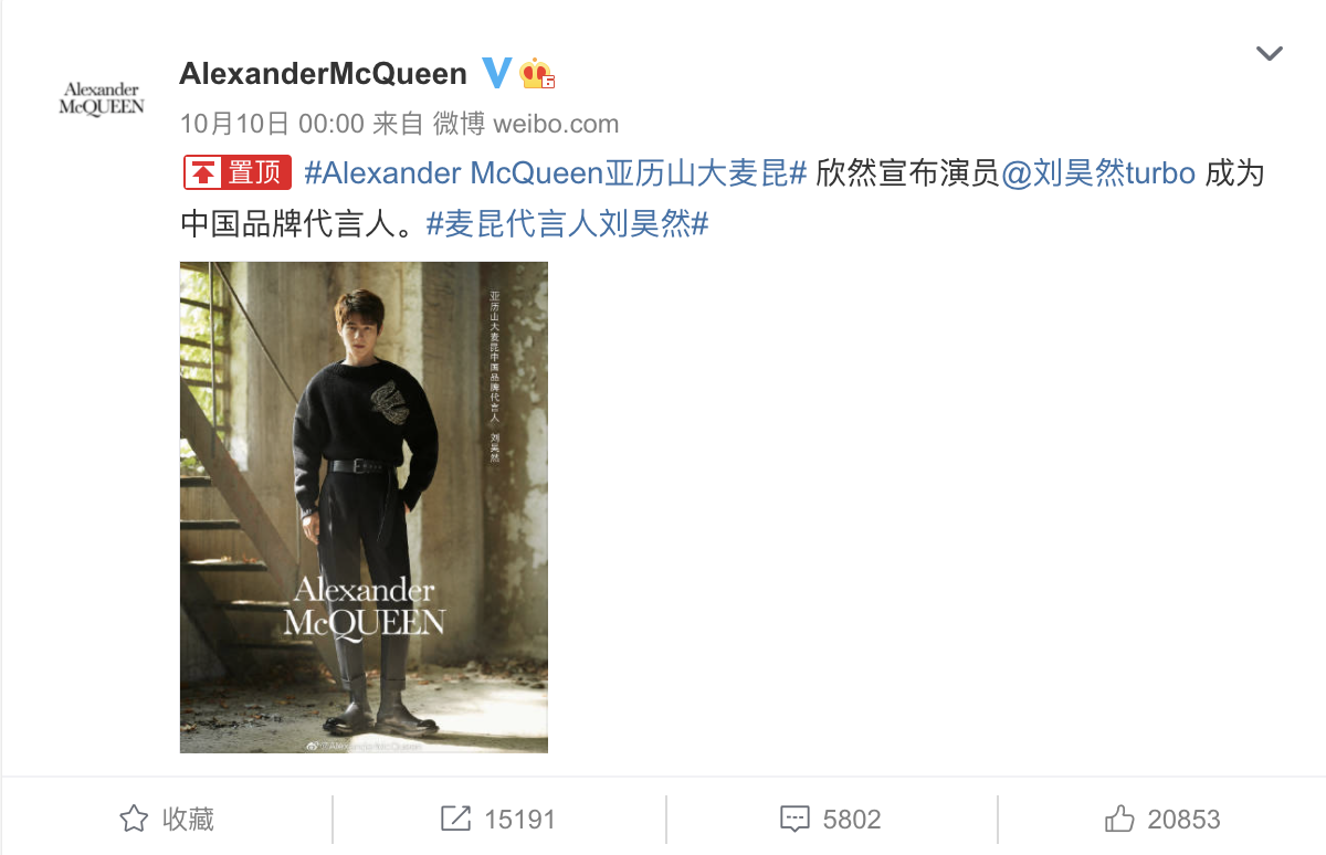 10月10日,Alexander McQueen通过官方微博账号宣布中国演员刘昊然成为新一任中国品牌代言人。截至发稿,Alexander McQueen的官宣微博获得超过5000条评论以及15000条转发,社交媒体互动率为近期最高。