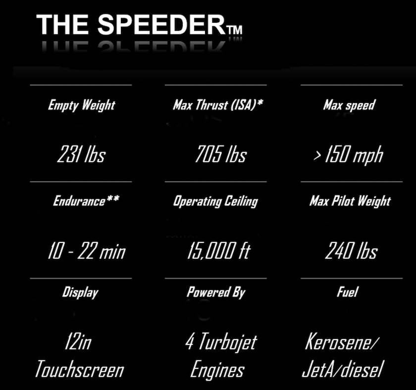 Speeder重300磅(约136公斤),能搭载比机车本身重两倍的重量,即最高承载约270千克,不过目前这款飞行摩托车设计上,可以看出只可坐两人。