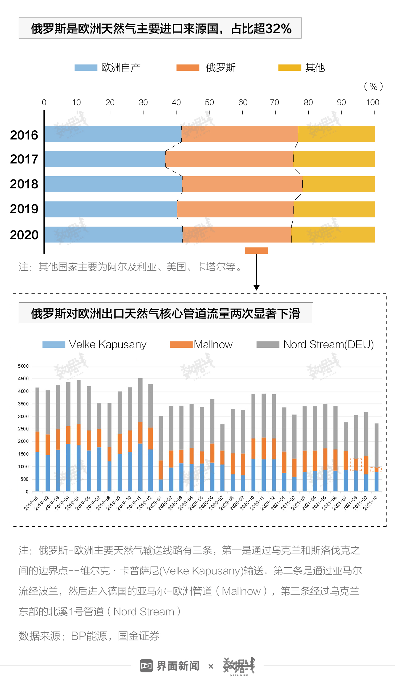 对于欧洲来说,除了内部自产天然气以外,俄罗斯是欧洲天然气的主要供应国,近五年占比均超过32%。截至10月7日,8月和10月份,俄罗斯对欧洲核心路线的天然气管道Mallnow(即亚马尔-欧洲天然气管道)的供应量均显著下滑,分别为往年正常时期的53%和21%。近日,俄罗斯表示计划增加对欧洲的管道供气量。