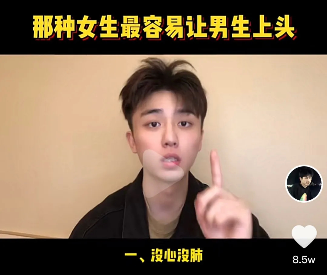 抖音博主“大大冯毛”总结了“最容易让男生上头”的女生类型:第一,没心没肺,这种女生出现就像一束阳光,给人无限开心;第二,共情力强,这种女生一般懂得换位思考,会为男生想方设法的解决问题;第三,神秘感强,女生的杀手锏永远来自她的神秘。