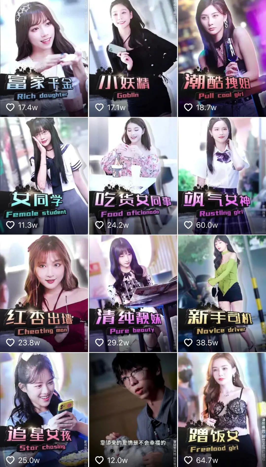 虽然有标签化女生的嫌疑,但抖音博主“小歪-追女仔”的视频还是很有可看性的。富家千金、飒气女神、潮酷拽姐、高端女主播、吃货女同事,看这些分类还以为是古早都市言情呢。用炫富引诱蹭饭女,用零食拿下吃货女,用碰瓷拿下追星女孩,本质都是用魔法打败魔法。