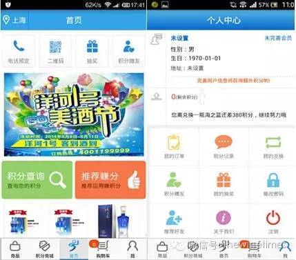 据了解,“洋河1号”上线至今,目前已开通手机APP、微信服务号、95019服务热线三种下单通道,首开酒企APP卖酒先河。消费者可以通过微信服务号及APP进行线上下单,体验30分钟到货付款的类即时购物。APP上产品售价比天猫旗舰店更加便宜,产品由公司地面经销商直接配送,不仅有白酒系列产品,如:海之蓝、天之蓝和梦之蓝为代表的蓝色经典系列,双沟君坊,洋河老字号等;还有红酒系列产品:如三星赤霞珠、五星梅洛、七星赤霞珠、拉丁之星等。消费者可以购买洋河、双沟、苏酒、星得斯(葡萄酒)等四大类25种热销产品,并且通过推荐好友安装、消费等积累积分,换购产品,参与抽奖。