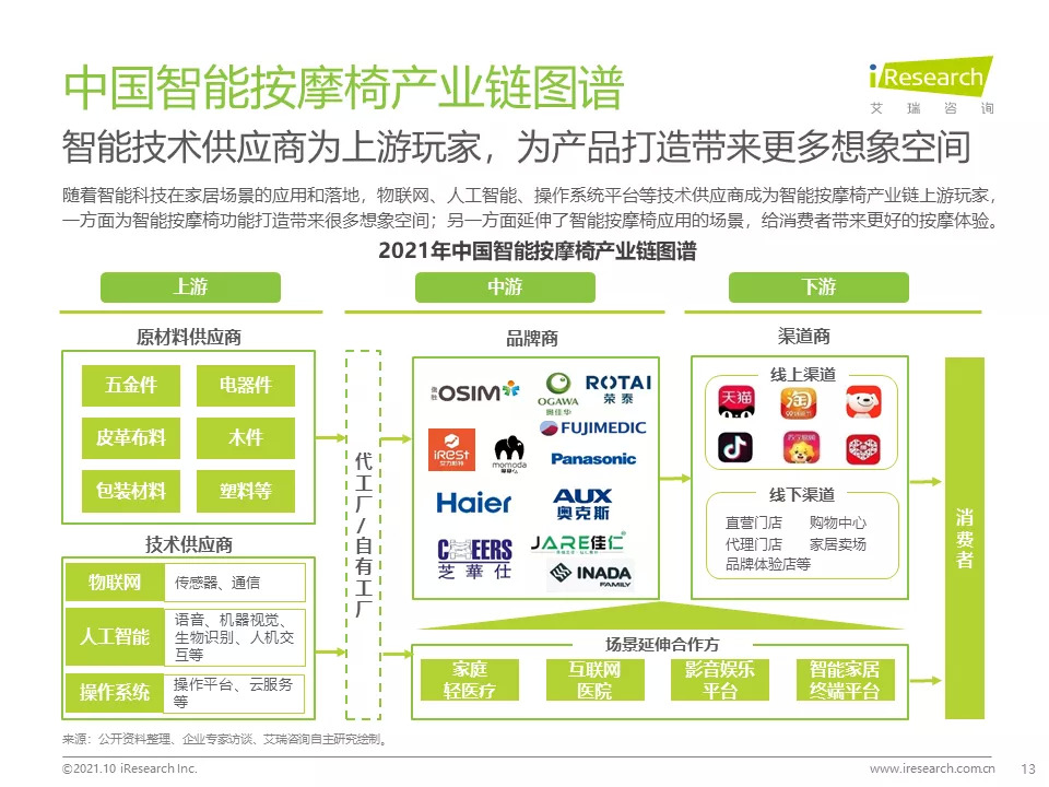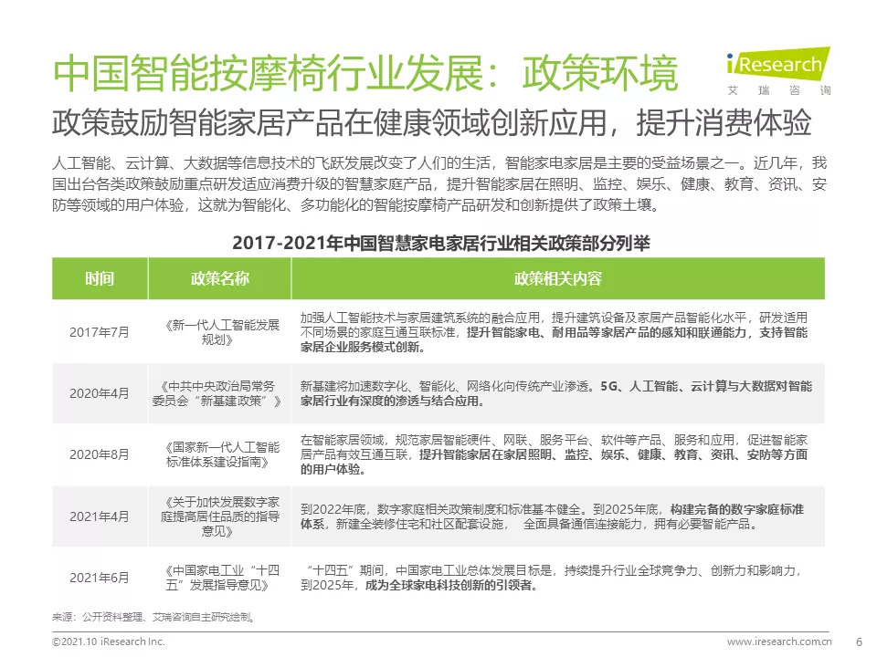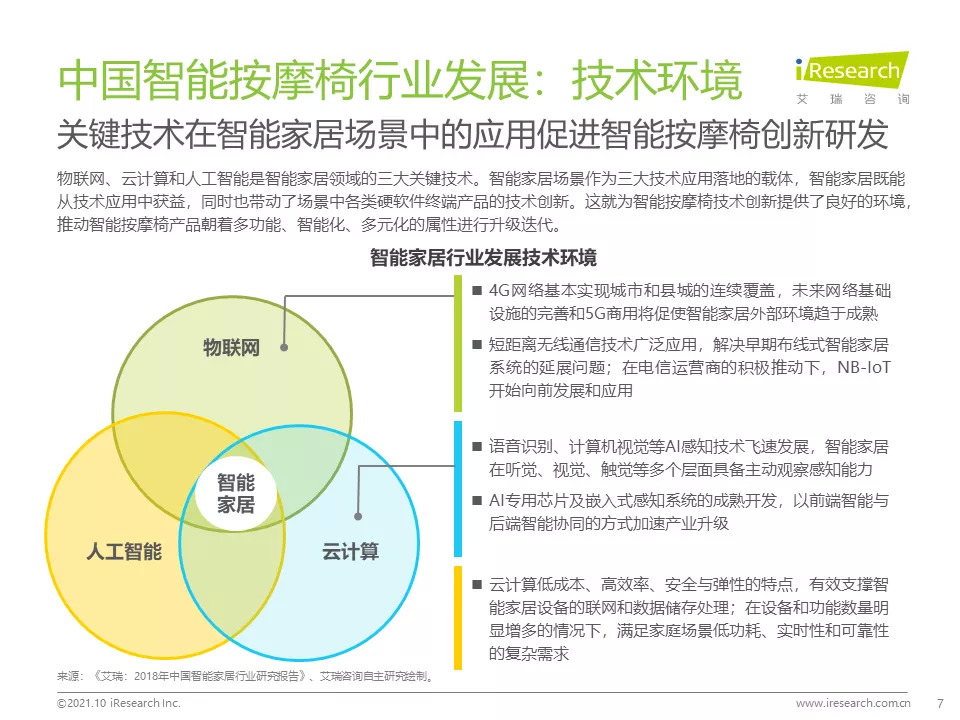 现阶段,中国已成为全球智能按摩椅产业链的中心;消费升级利好大健康发展,智能按摩椅行业迎来发展契机;智能科技在家居产品中被广泛应用,极大提升消费体验,促进相关产品创新;人口老龄化及中青年群体亚健康问题拉升智能按摩椅消费需求;关键技术在智能家居场景中的应用促进智能按摩椅创新研发