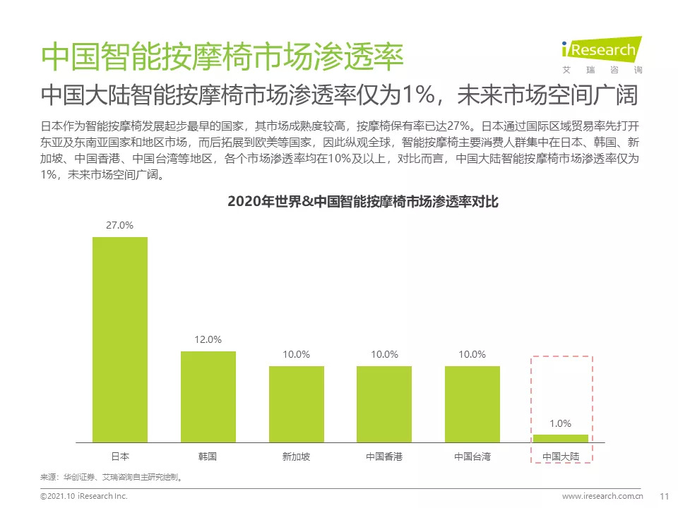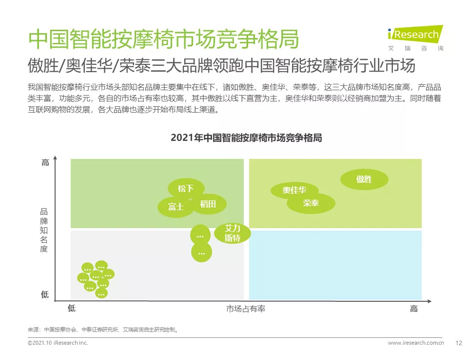 中国按摩器具市场中智能按摩椅占比最高,市场规模约82.8亿;中国大陆智能按摩椅市场渗透率仅为1%,未来市场空间广阔;傲胜/奥佳华/荣泰三大品牌领跑中国智能按摩椅行业市场;智能技术供应商成为上游玩家,为产品打造带来更多想象空间